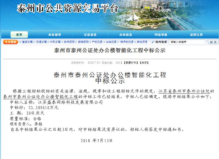 中標(biāo)喜訊--泰州市泰州公證處辦公樓智能化工程