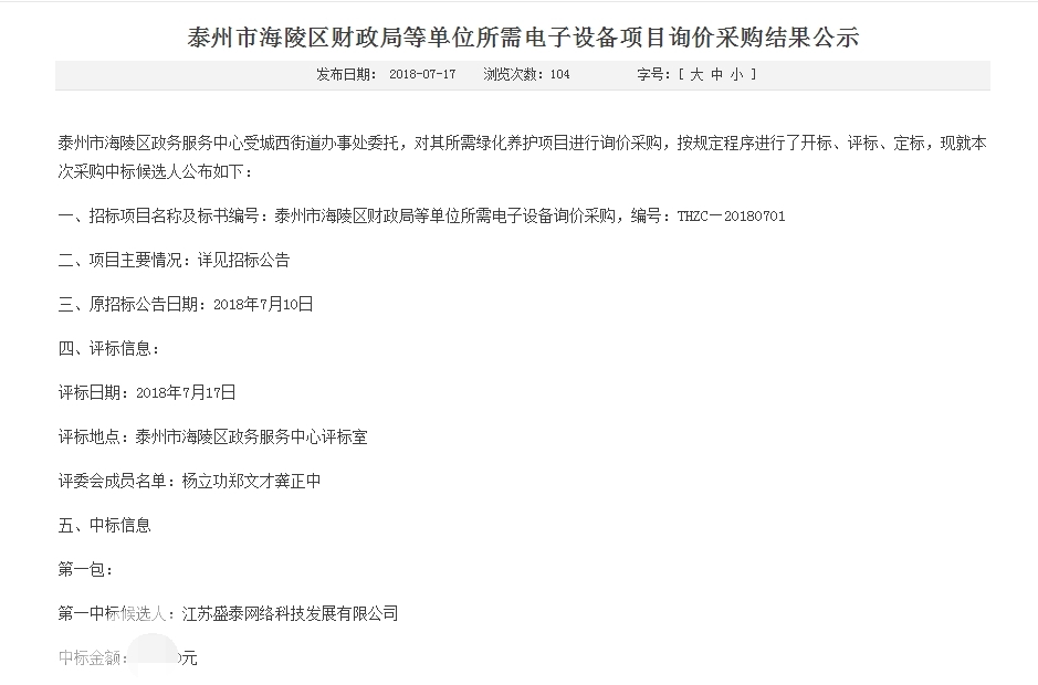 中標(biāo)喜訊--泰州市海陵區(qū)財(cái)政局電子設(shè)備采購